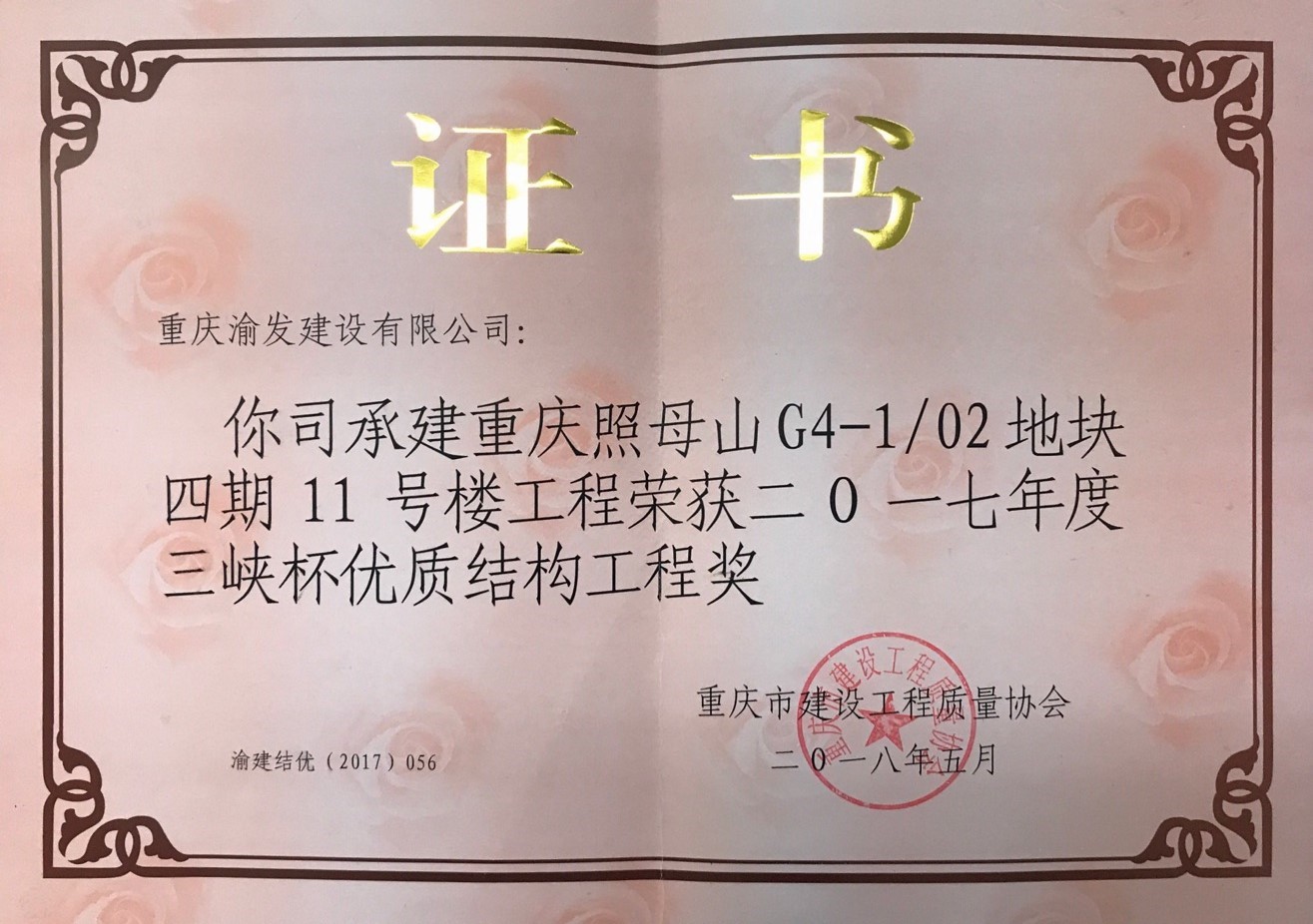 我司承建的重庆照母山G4-1/02地块四期11号楼工程荣获2017年度"三峡杯"优质结构工程奖。"三峡杯"优质结构工程奖是重庆市市级建设工程质量奖,每年评选一次...