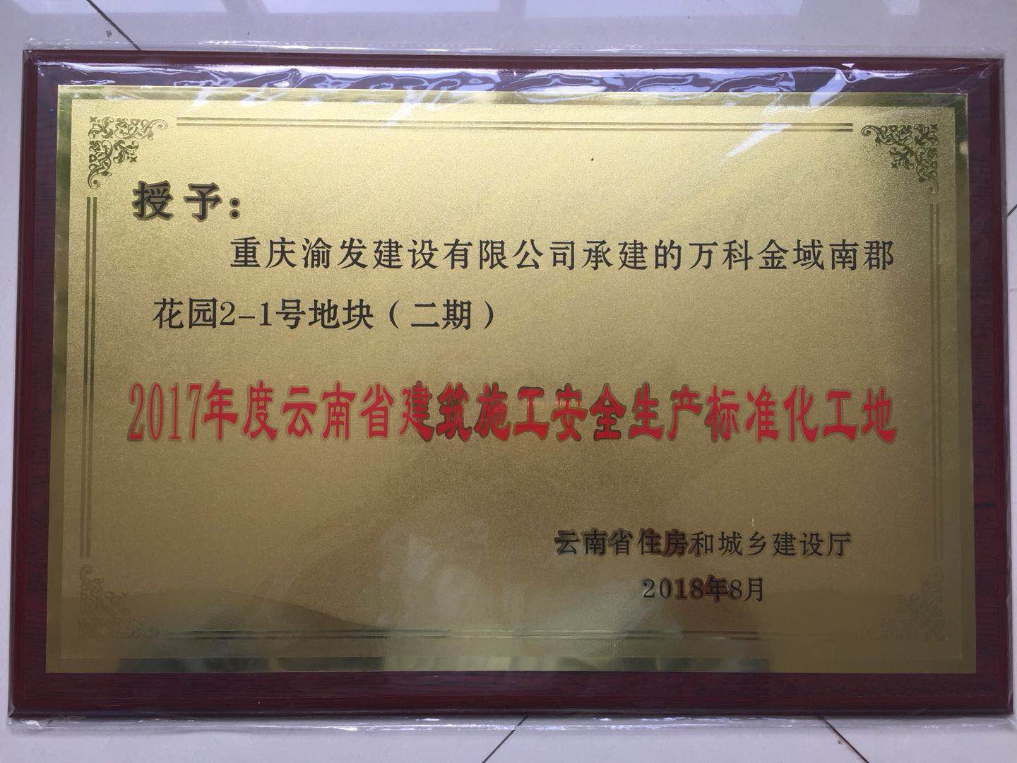 我司承建的昆明万科金域南郡花园2-1号地块(二期)工程、昆明万科金域南郡花园3号地块二标段三期工程荣获“云南省建筑施工安全生产标准化工地”称号。